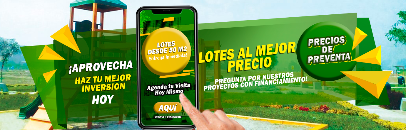 Proyectos LOTES LOTESCOMERCIALES PROYECTOSENTREGADOS TACNA URBANIZACIÓN BUENOS AIRES TACNA RESIDENCIAL CRISTO REY TACNA URBANIZACION LA ARBOLERA TACNA RESIDENCIAL CREISTO REY II ETAPA TACNA RESIDENCIAL NUEVA ESPERANZA TACNA RESIDENCIAL HUMBOLT INVIERTE EN TU FUTURO ¡COMPRA HOY! Regístrate para brindarte excelentes beneficios. —Por favor, elige una opción—Proyecto de interesBuenos AiresNueva Esperanza —Por favor, elige una opción—¿Cómo te enteraste?FacebookInstagramGoogleVolantes Δ